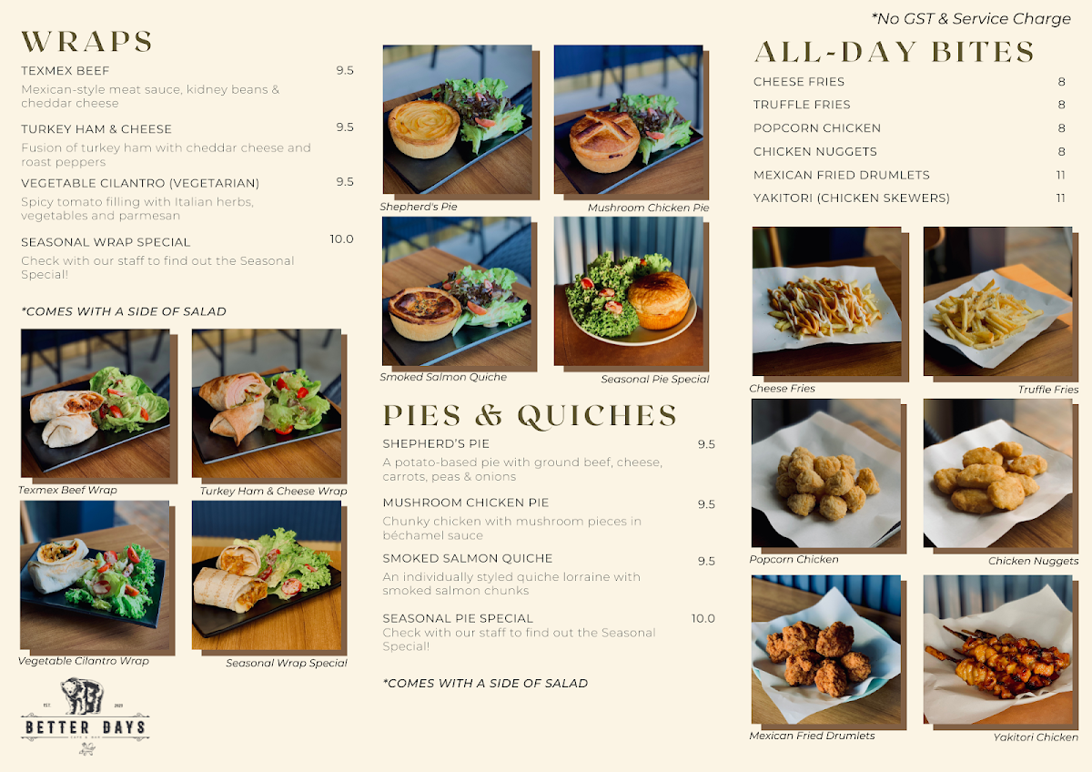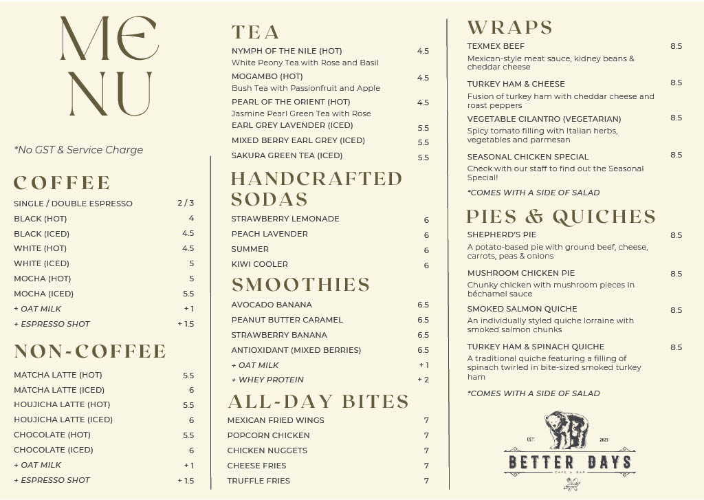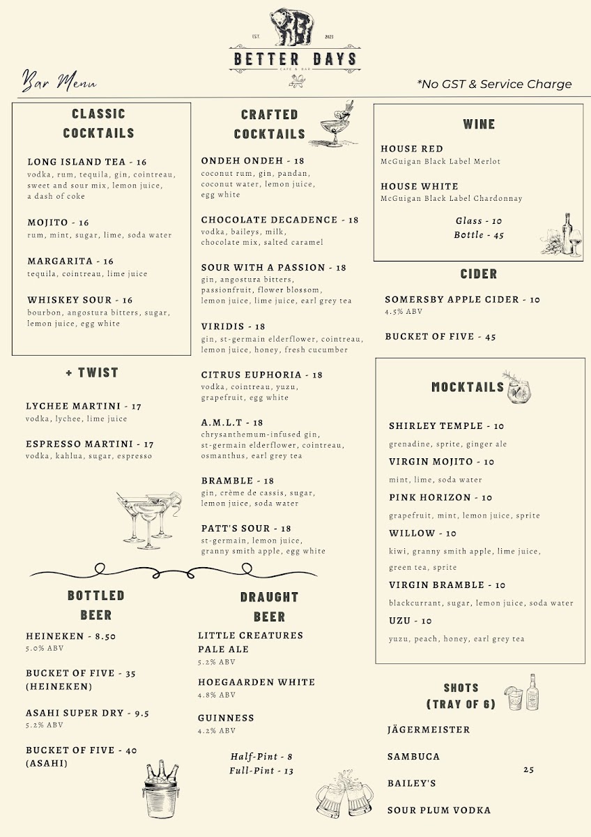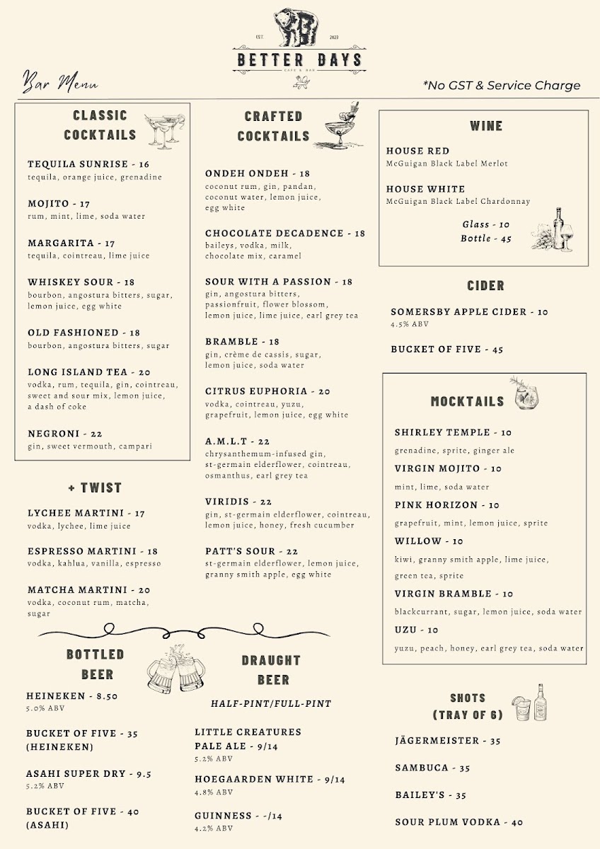 As the day fades, the atmosphere at Better Days transforms into a lively bar scene. With a diverse bar menu featuring crisp draught beers, handcrafted cocktails, and bold whiskeys, there's something for everyone. Don't miss their enticing Draught Beer Promotion, where you can enjoy ice-cold pints like Hoegaarden and Guinness for just $11.90 nett from 2–7 PM daily – perfect for those post-work chill-out sessions!